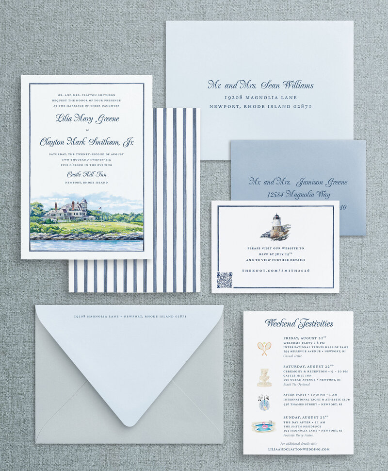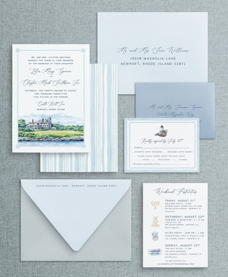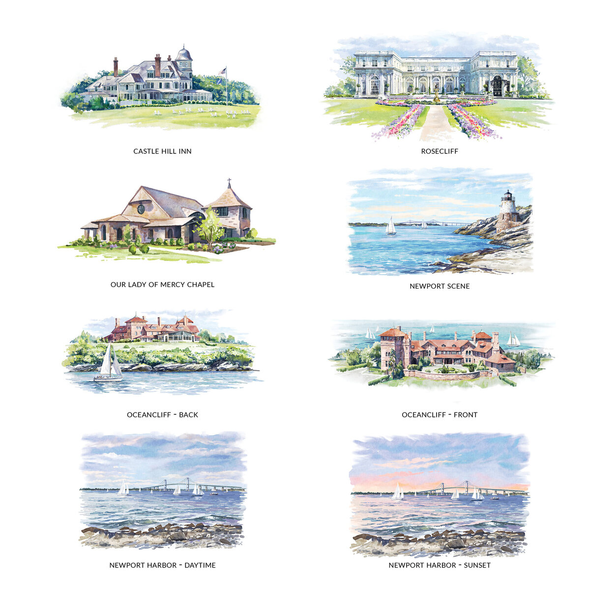 The Watercolor Venue Suite features a hand-painted rendering of your wedding location — a personal, artful way to introduce guests to the setting of your celebration. Choose from a curated list of venues across New England and beyond, or commission your venue watercolor for only $275. Each suite includes your choice of icons for the RSVP and optional details card, ensuring every element feels like you.