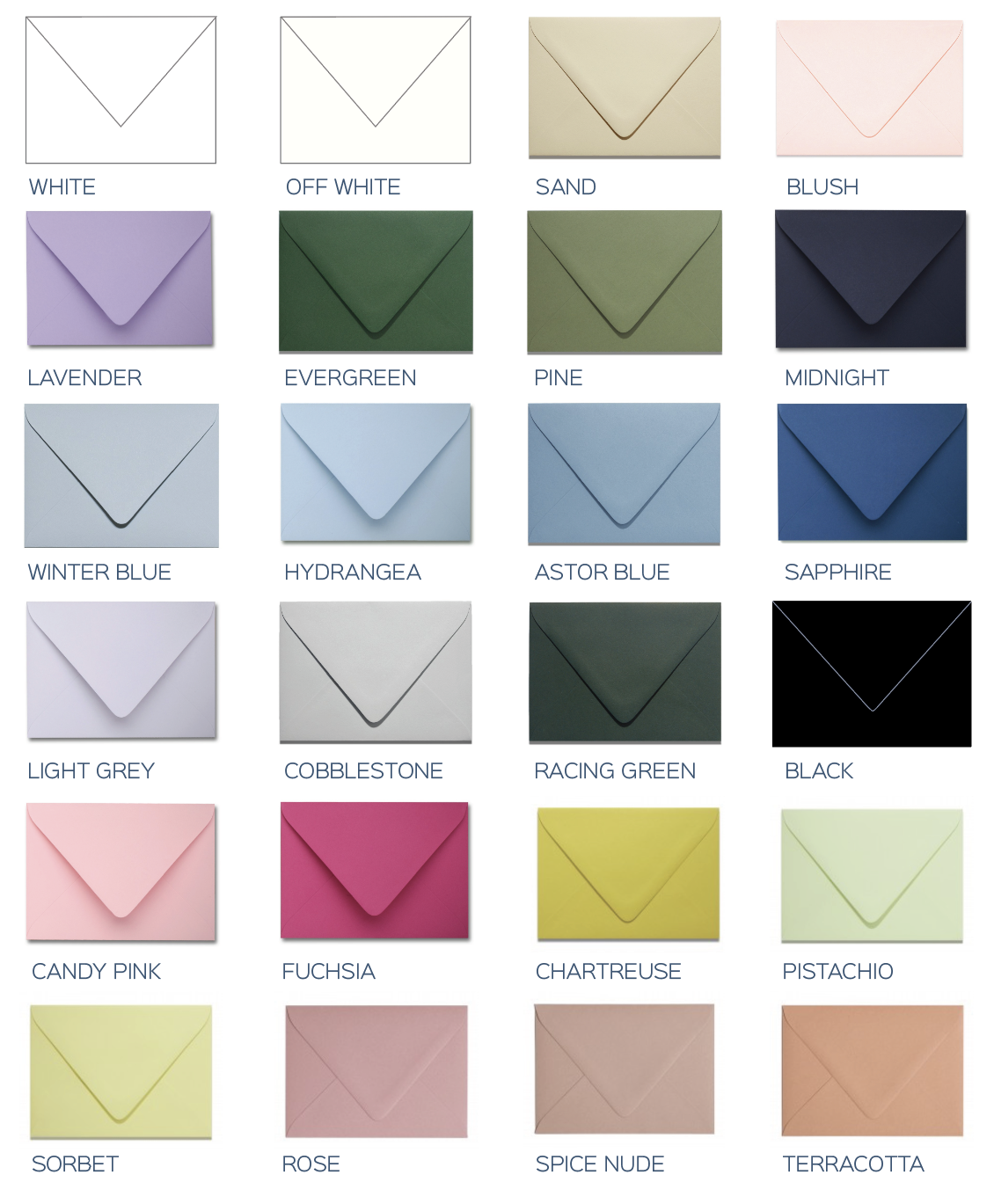 Standard envelopes are Euro Flap (Deep point) and are available in White, off white and 14 standard colors. Selecting a colored envelope is a fun way to dress up your invitation suite!